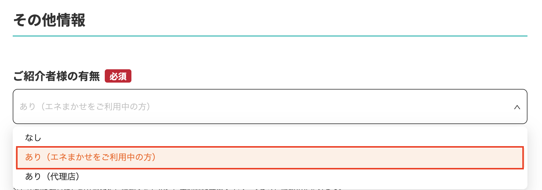 - ご紹介者様の有無の項目で「あり(エネまかせをご利用中の方)」にチェックをつける。